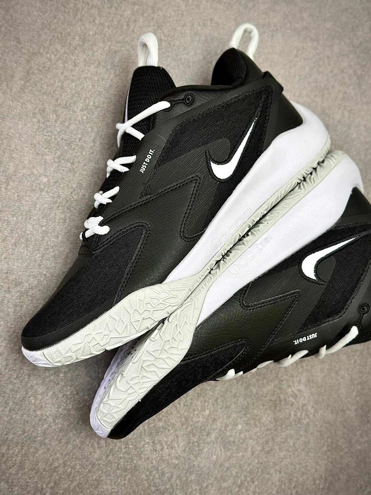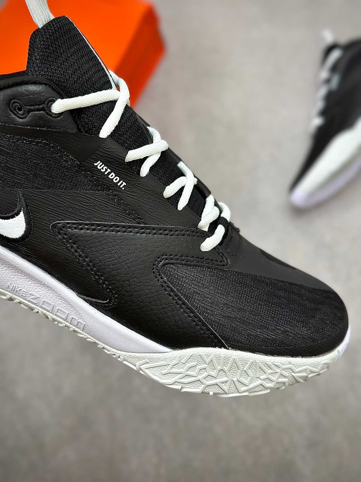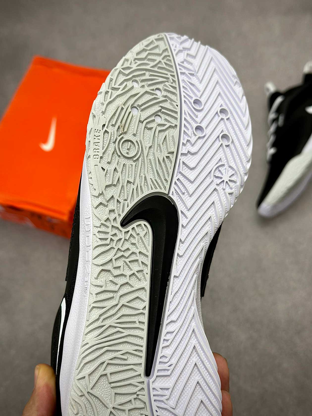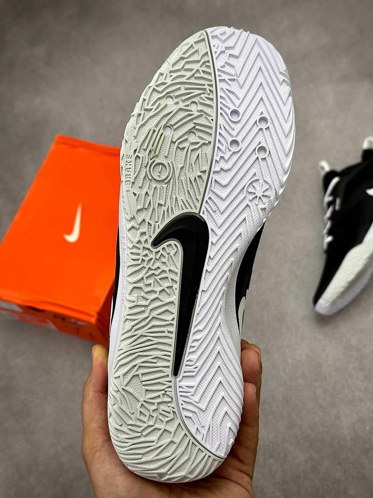 زیره لاستیکی کفش با چسبندگی مناسب مخصوص زمینهای سالنی، تعادل خوبی در توقفهای ناگهانی، استارتهای سریع و فرودها فراهم میکند و از سر خوردن روی کف سالن جلوگیری میکند.