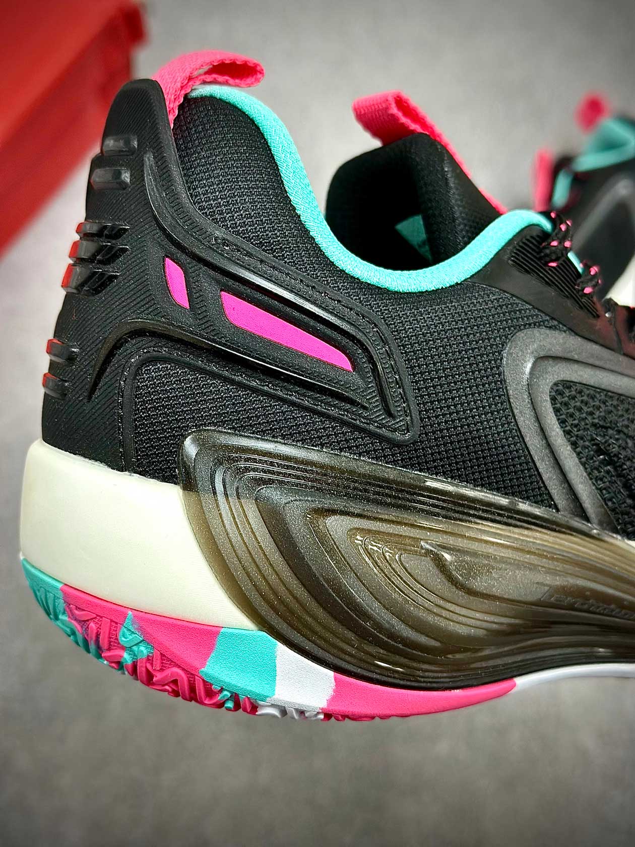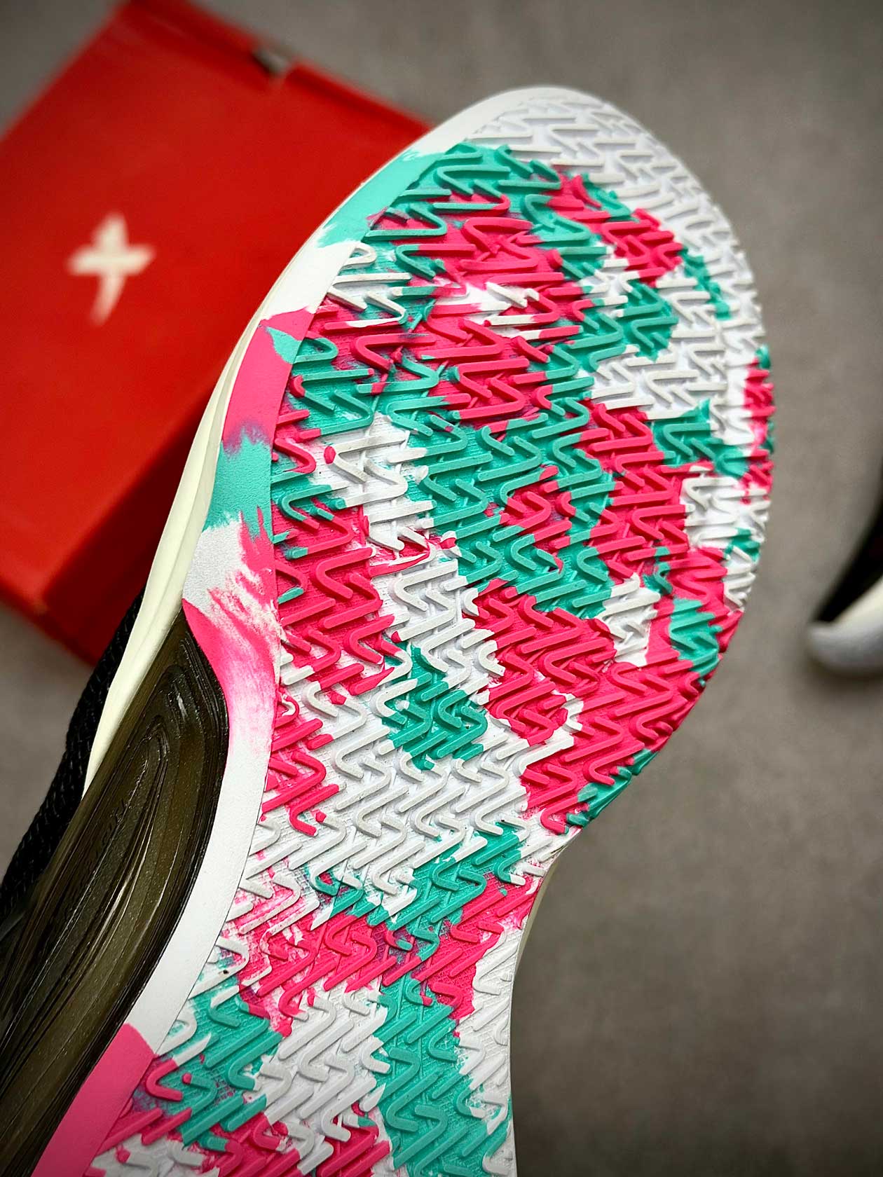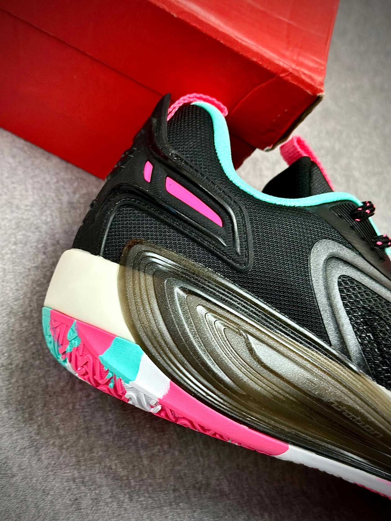 زیره لاستیکی کفش با چسبندگی بالا مخصوص زمینهای بسکتبال سالنی، عملکرد قابلاعتمادی در استارتهای سریع، توقفهای ناگهانی و تغییر جهتها ارائه میدهد و از سر خوردن روی کف سالن جلوگیری میکند.