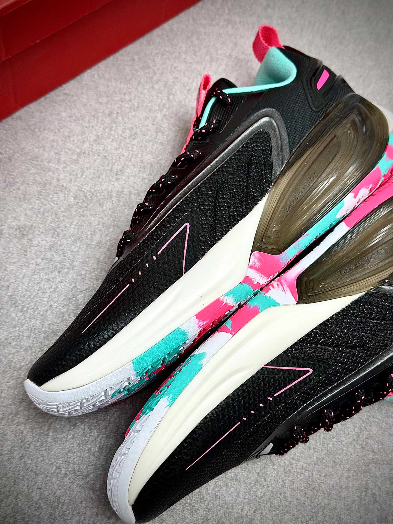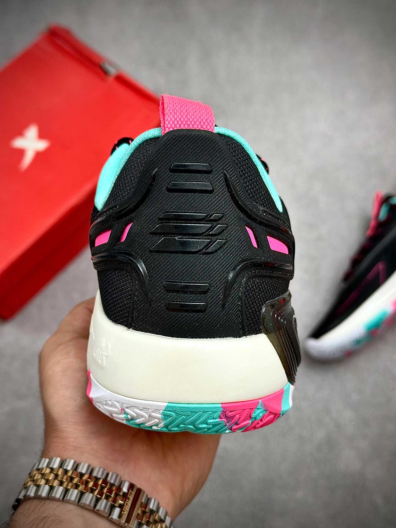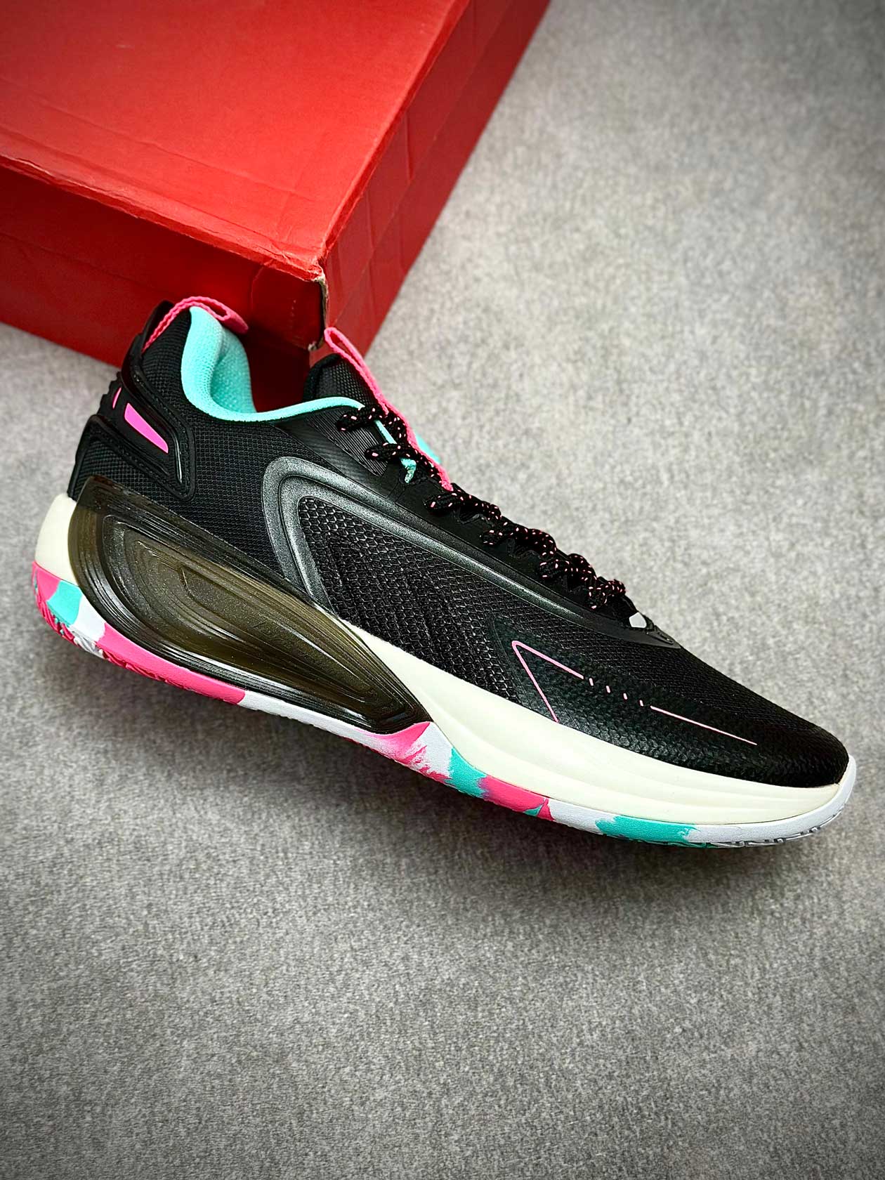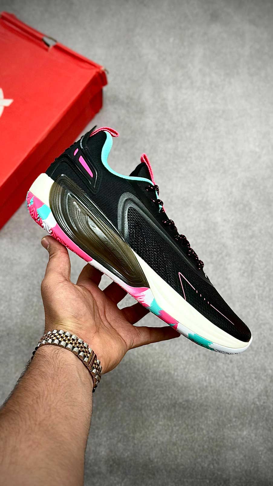 زیره لاستیکی کفش با چسبندگی بالا مخصوص زمینهای بسکتبال سالنی، عملکرد قابلاعتمادی در استارتهای سریع، توقفهای ناگهانی و تغییر جهتها ارائه میدهد و از سر خوردن روی کف سالن جلوگیری میکند.